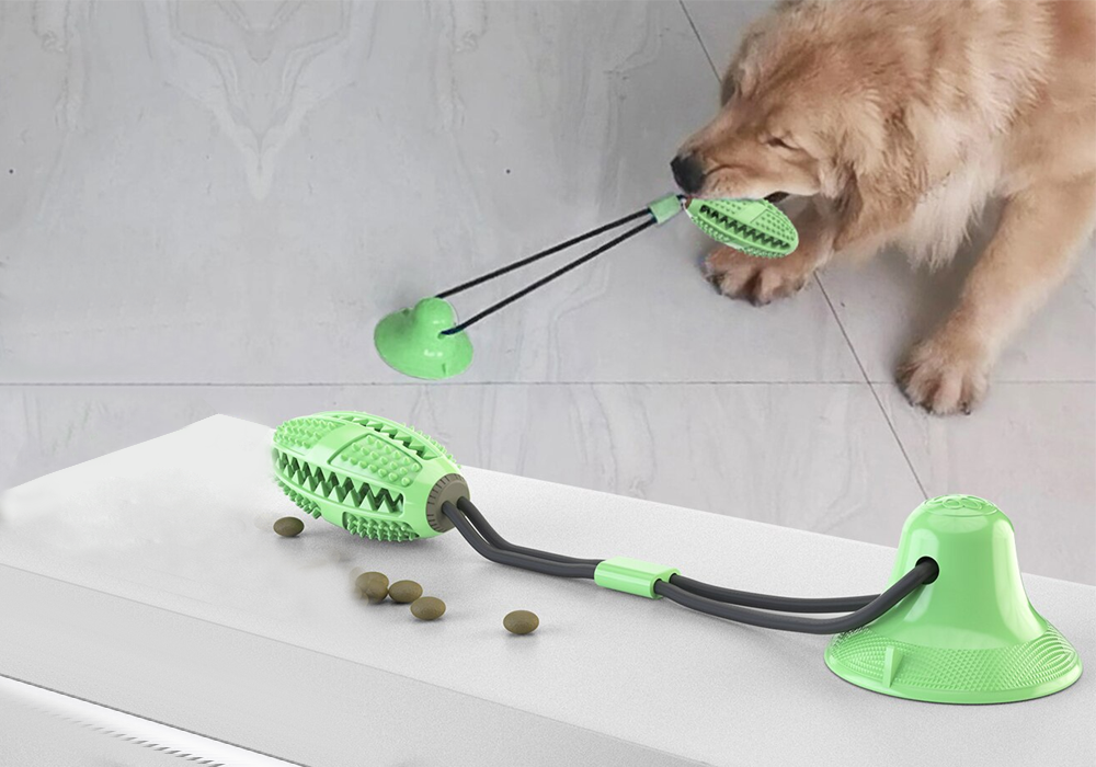 Suction cup dog toy can be used as a dog chew toy tooth cleaning toy or tug of war toy which can train pets agility well and can also be used for food distribution made of rubber material soft and durable very suitable for dogs the bright appearance is very attractive to dogs and prevents them from rejecting it designed with a suction cup it can be glued to the floor allowing the pet to play and let go encourage the dog to exercise more to prevent it from gaining weight and be healthy