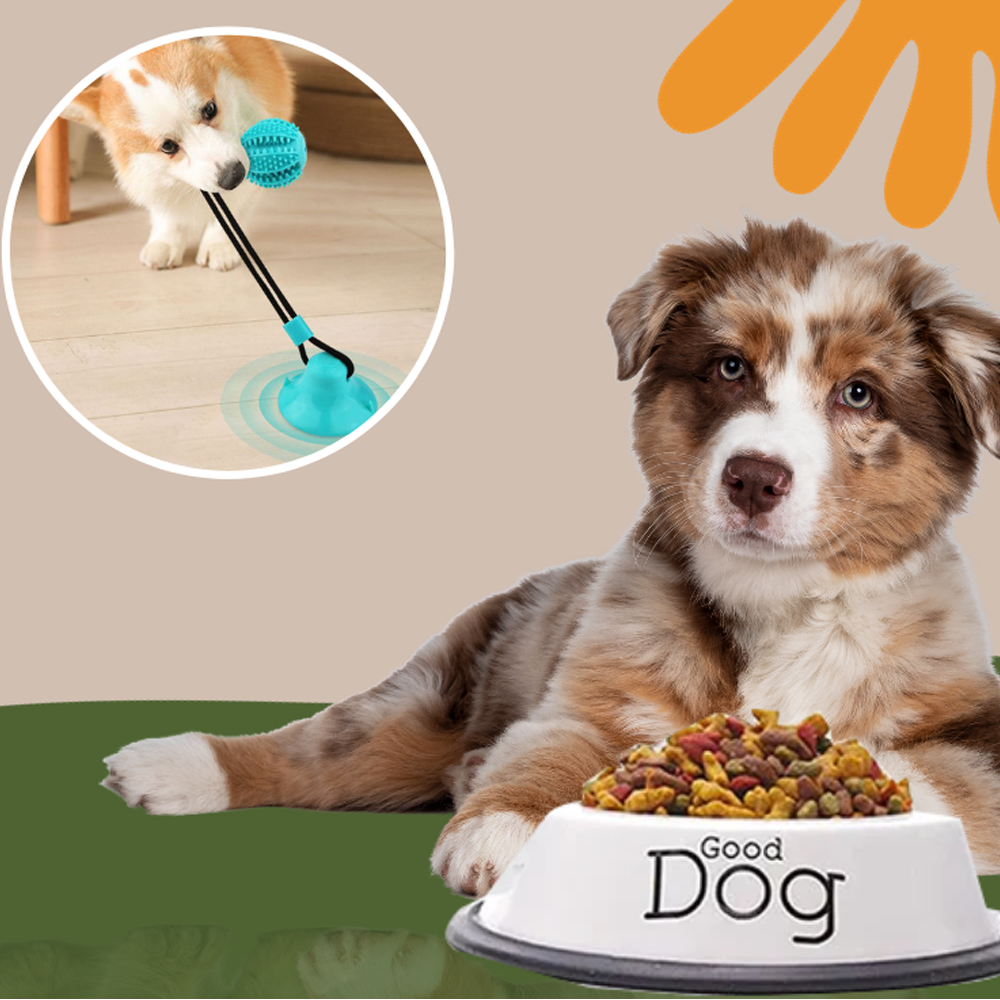 Suction cup dog toy can be used as a dog chew toy tooth cleaning toy or tug of war toy which can train pets agility well and can also be used for food distribution made of rubber material soft and durable very suitable for dogs the bright appearance is very attractive to dogs and prevents them from rejecting it designed with a suction cup it can be glued to the floor allowing the pet to play and let go encourage the dog to exercise more to prevent it from gaining weight and be healthy